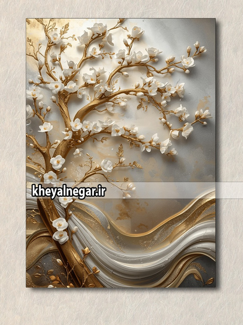 این اثر هنری زیبا، تصویری از درختی با شاخههای طلا و گلهای سفید را به نمایش میگذارد که در کنار موجها طراحی شده است. این تابلو حس آرامش و زیبایی را به فضای شما منتقل میکند و نمادی از زندگی و طبیعت است. 🌿✨