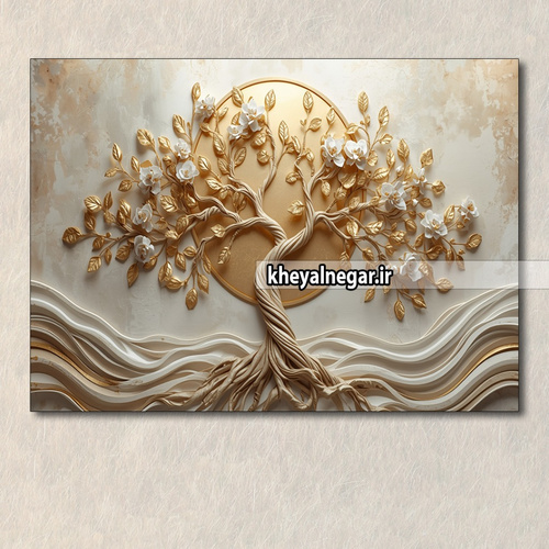 تابلو عکس درخت طلایی با شکوفه های سفید و برگ های طلایی _ کد C40