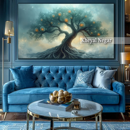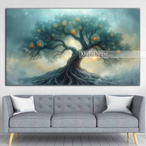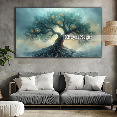 درختی ریشهدار و استوار در مرکز تصویر، نمادی از رشد، قدرت و جریان زندگی است. تضاد میان مه لطیف پسزمینه و درخشش نورهای گرم، تعادل بصری دلنشینی ساخته که این اثر را به نقطه کانونی هر فضا تبدیل میکند.